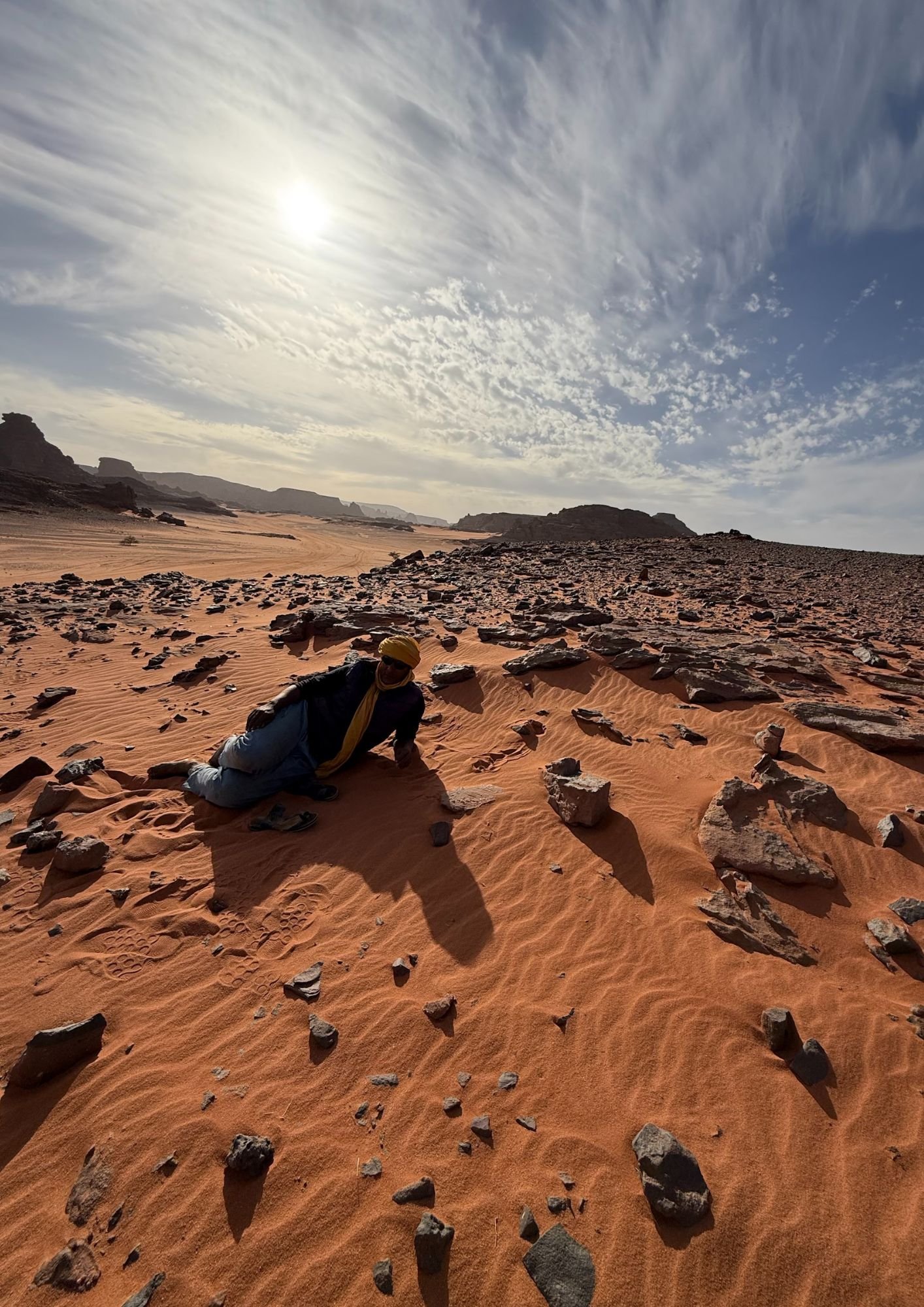 Enfant du Tassili n’Ajjer, Houssayne est né et a grandi au milieu des montagnes de grès et de l’infini du Sahara. Issu d’une lignée touarègue ancrée à Djanet depuis des générations, il détient une mémoire vivante des chemins ancestraux et des récits du désert.