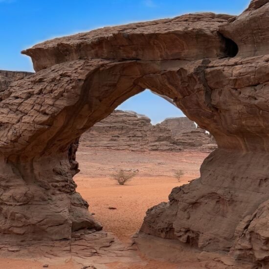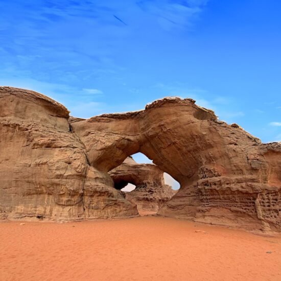 Le Tadrart Rouge est bien plus qu’une destination : c’est le chef-d’œuvre absolu du Sahara. Imaginez une véritable mer de sable de feu, célèbre pour ses dunes géantes aux nuances de rouge et d’ocre. Ici, la nature offre un spectacle visuel qui se métamorphose à chaque heure du jour, pour culminer dans l’embrasement spectaculaire du coucher de soleil. Au fil des millénaires, le vent et le temps ont sculpté d’immenses architectures naturelles, érigeant des arches de pierre et des pitons rocheux aux formes fantastiques qui transforment le désert en une galerie d’art à ciel ouvert.