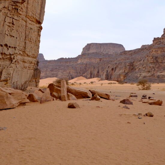 Toute la magie de la Tadrat : dunes majestueuses aux couleurs changeantes, rochers échoués tels des vaisseaux en pleine mer ou des châteaux forts.