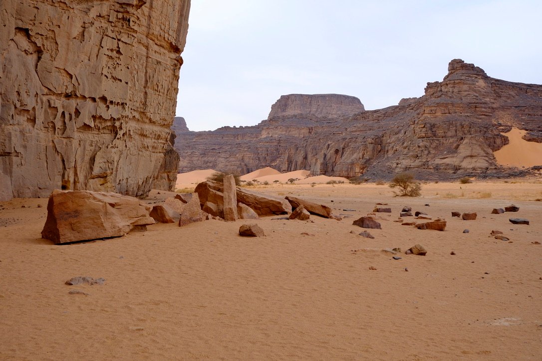 Nous sortons de la Tadrart pour rejoindre le Tassili de Monhor dans l’après midi ; vastes couloirs de pierre, de grottes au milieu de rues de sable.